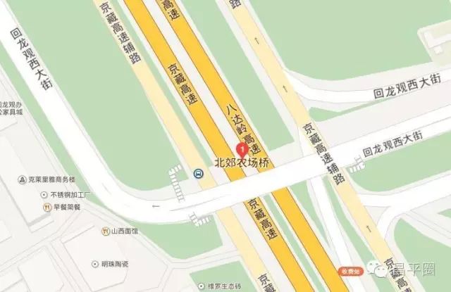 回龙观北郊农场桥横跨京藏高速,东侧为回龙观镇,西侧则连接西城区回迁小区融泽家园以及回龙观建材市场。每天早晨,居住在回龙观的几十万市民都要经过这座桥进入京藏高速西辅路到城里上班。