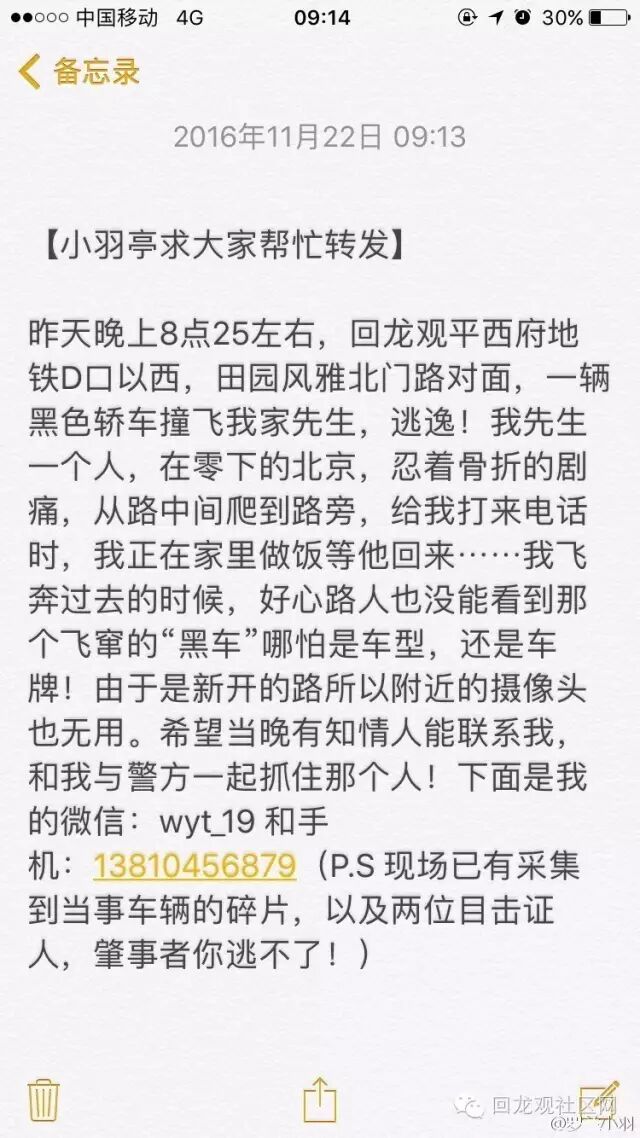 网友求助11月21日晚上8点25左右,回龙观平西府地铁D口以西,田园风雅北门路对面,一辆黑色轿车撞飞我家先生,逃逸!我先生一个人,在零下几度的北京,忍着骨折的剧痛,从路中间爬到路旁,给我打来电话时,我正在家里做饭等他回来⋯⋯我飞奔过去的时候,好心路人也没能看到那个飞窜的“黑车”哪怕是车型,还是车牌!由于是新开的路所以附近的摄像头也无用。希望当晚有知情人能联系我,和我与警方一起抓住那个人!联系方式:13810456879目前通过交管部门获知的最新消息:肇事嫌疑车是一辆黑色索纳塔轿车,外埠号牌。(P.S: 现场已有采集到当事车辆的碎片,以及两位目击证人,肇事者你逃不了!)