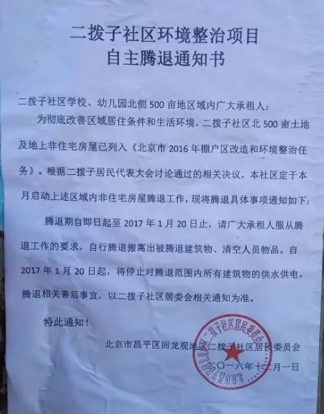 腾退期自即日起至2017年1月20日止,请广大承租人服从腾退工作的要求,自行腾退搬离出被腾退建筑物,清空人员物品。自2017年1月20日起,将停止对腾退范围内所有建筑的供水供电。腾退相关善后事宜,以二拨子社区居委会相关通知为准。